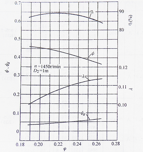 本样本只给NO.10样机的无因次性能表及曲线(见下图)、由该性能表和曲线计算NO.10以上风机的有因次性能参数。